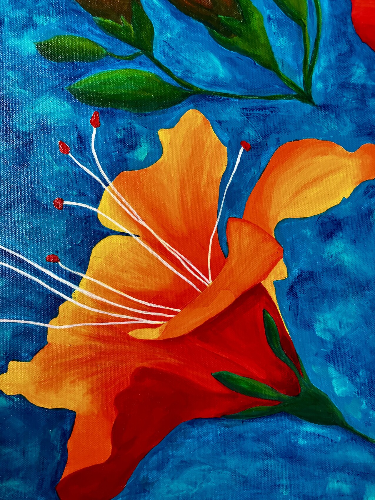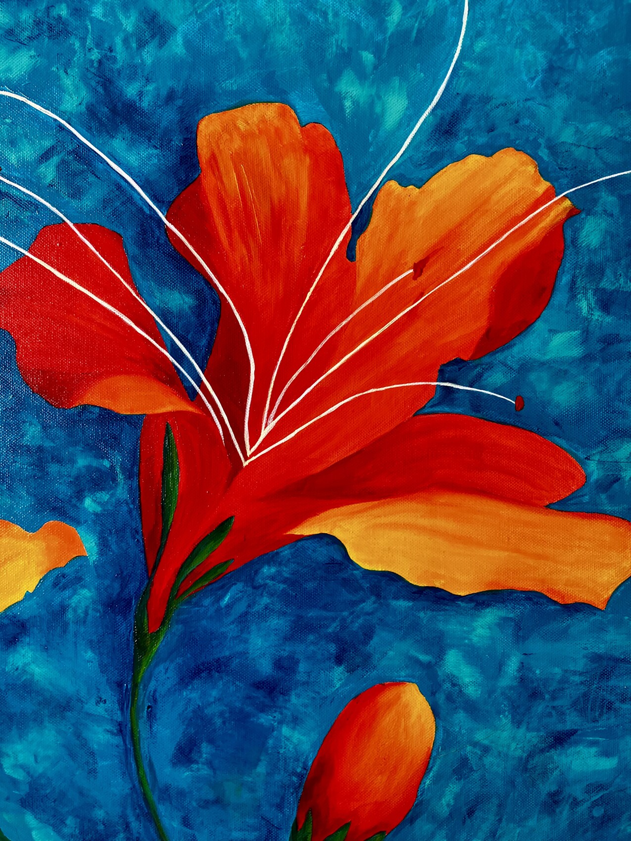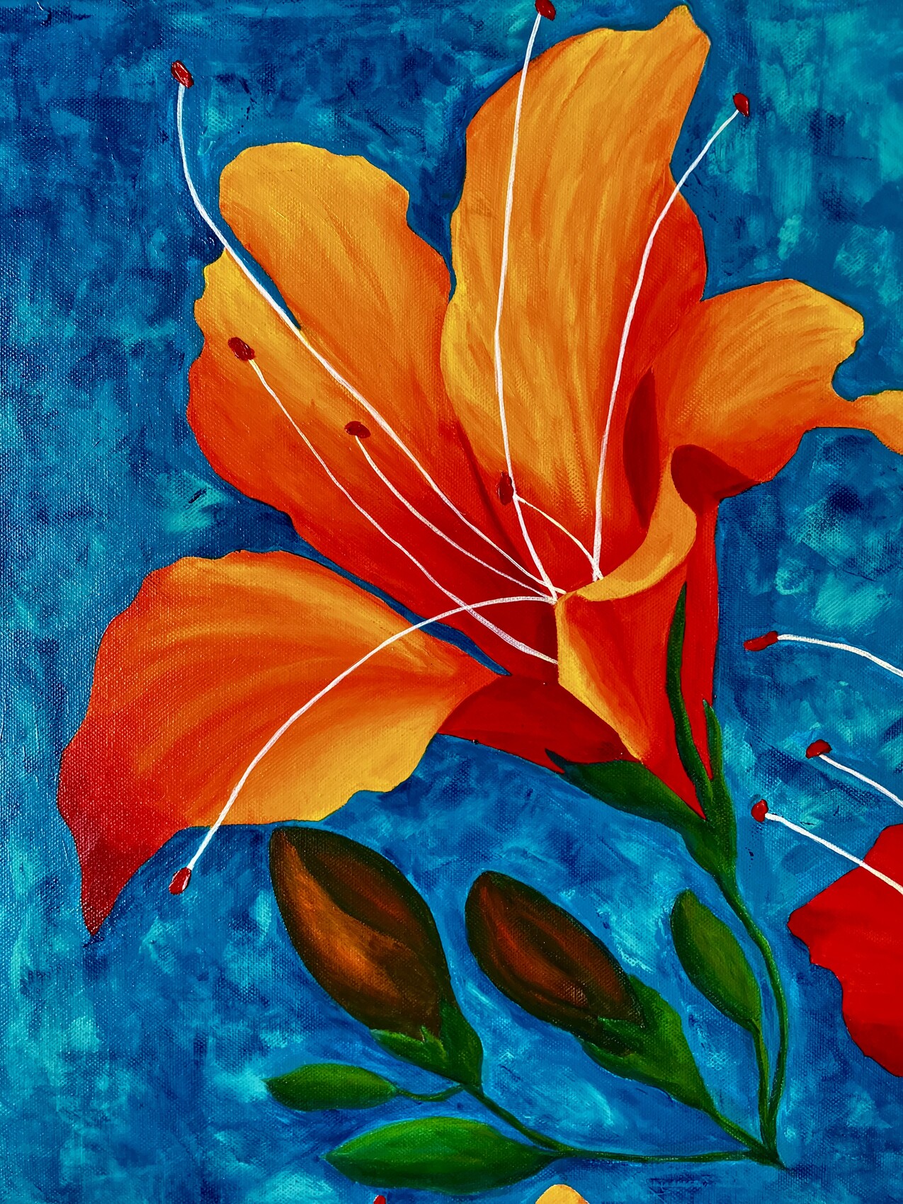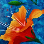 Dans cette œuvre, j'ai voulu capturer la vitalité éclatante des lys sous un ciel azur, mêlant la chaleur de l'orange au calme du bleu. Chaque coup de pinceau exprime l'énergie de la nature en pleine floraison, apportant lumière et fraîcheur à votre intérieur, comme un souffle de vie et d'espoir. C'est un hymne à la beauté simple et vibrante qui enchante l'âme.